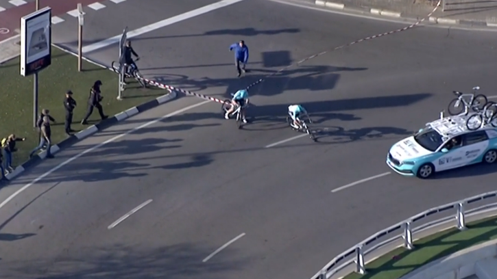 'Oh no!' - Rider tangled in ribbon after wrong turn, but team-mate lets him win