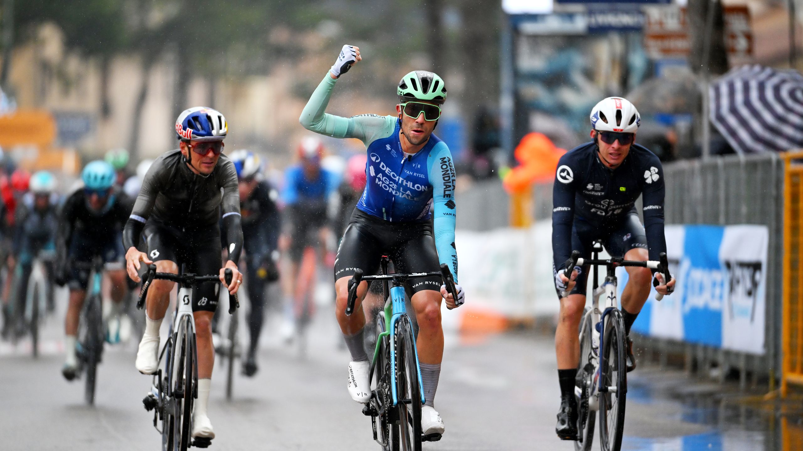 It’s the third Italian win on the bounce with the Decathlon-AG2R La Mondiale rider striking out early – with 200m to go – on the uphill drag to the line. Vendrame holds off Tom Pidcock for a huge win.
