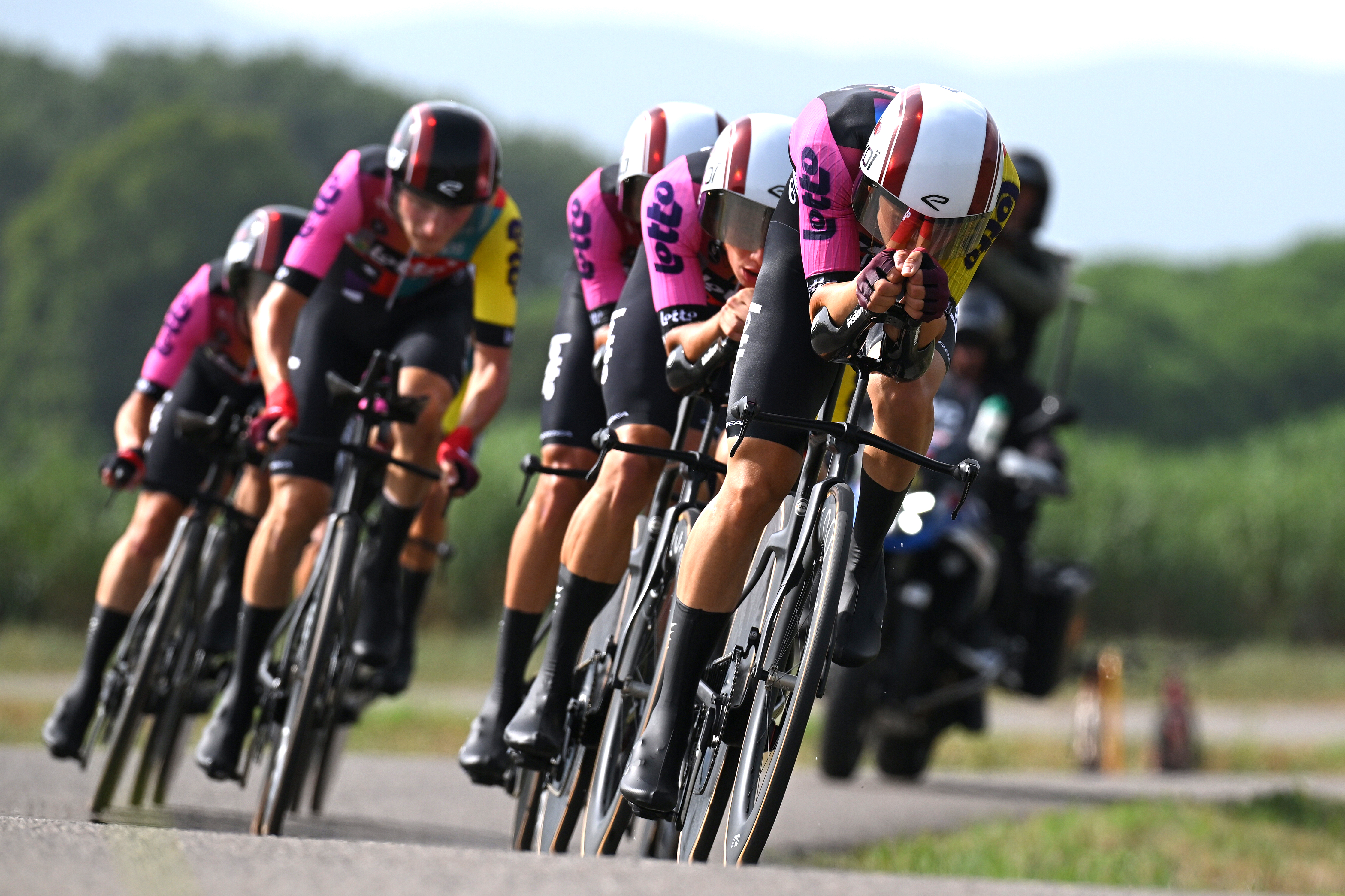 Now 18 seconds behind Lidl-Trek at the second check, in 10th place. If they didn't have a camera on their bums, you'd think something had to have happened. Lidl-Trek are looking very happy in their Tissot chairs.